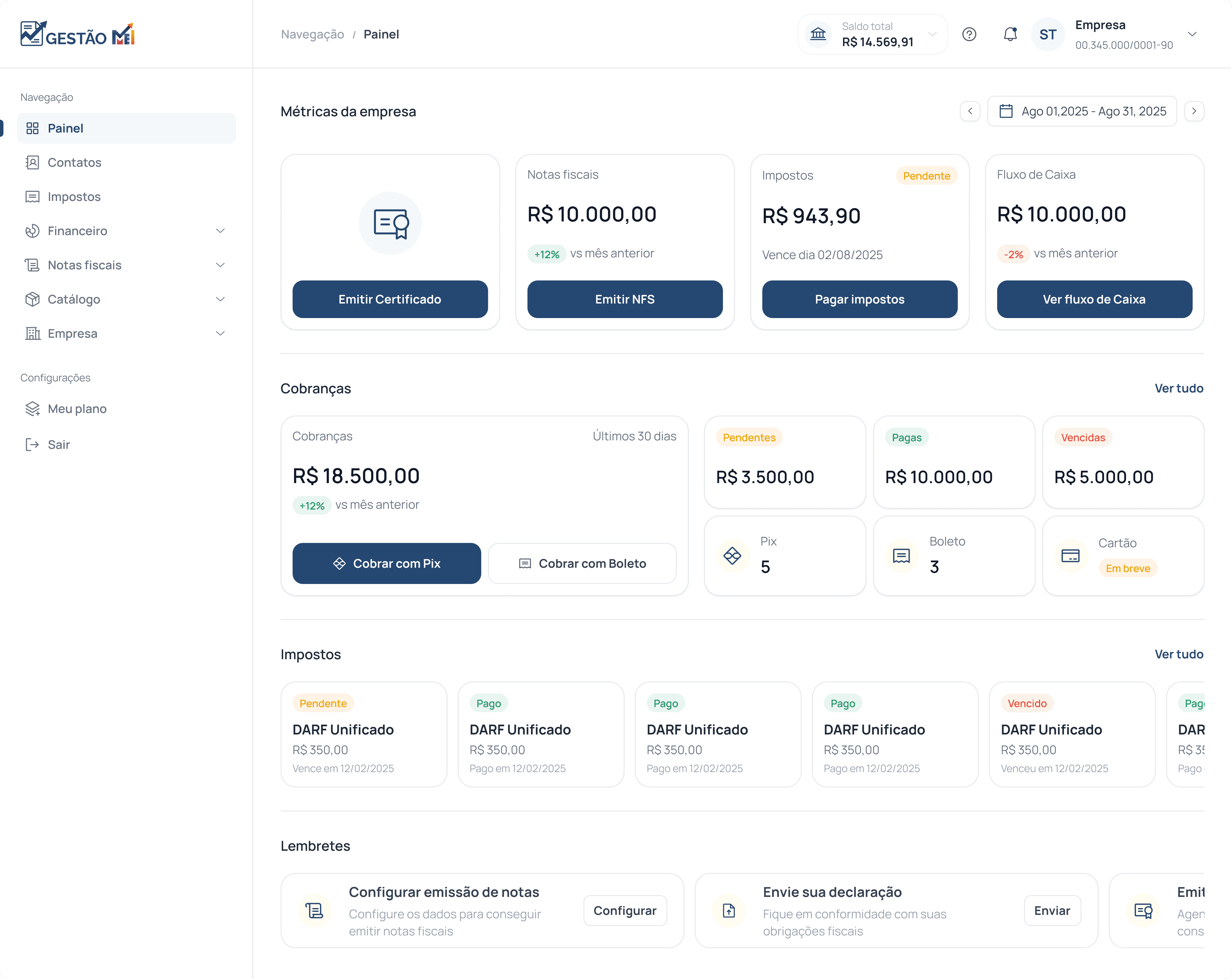 Organize sua empresa em um só lugar: Emita notas fiscais, acompanhe o fluxo de caixa e pague seu DAS com facilidade. Um sistema completo, simples e integrado.